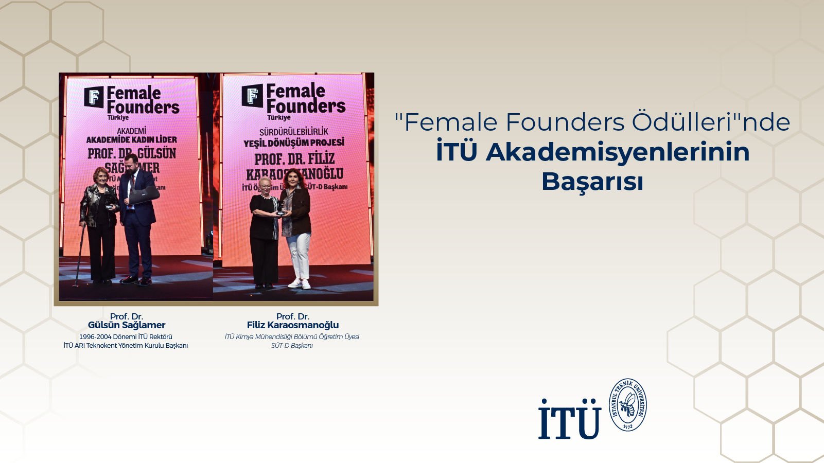 Bu yıl ilk kez düzenlenen “Female Founders Türkiye Ödülleri”nde, İTÜ Kimya Mühendisliği Bölümü Öğretim Üyesi, SÜT-D Başkanı, Prof. Dr. Filiz Karaosmanoğlu “Yeşil Dönüşüm Projesi Ödülü”ne; önceki İTÜ Rektörlerinden, İTÜ ARI Teknokent Yönetim Kurulu Başkanı Prof. Dr. Gülsün Sağlamer “Akademinin Kadın Lideri Ödülü”ne layık görüldü.